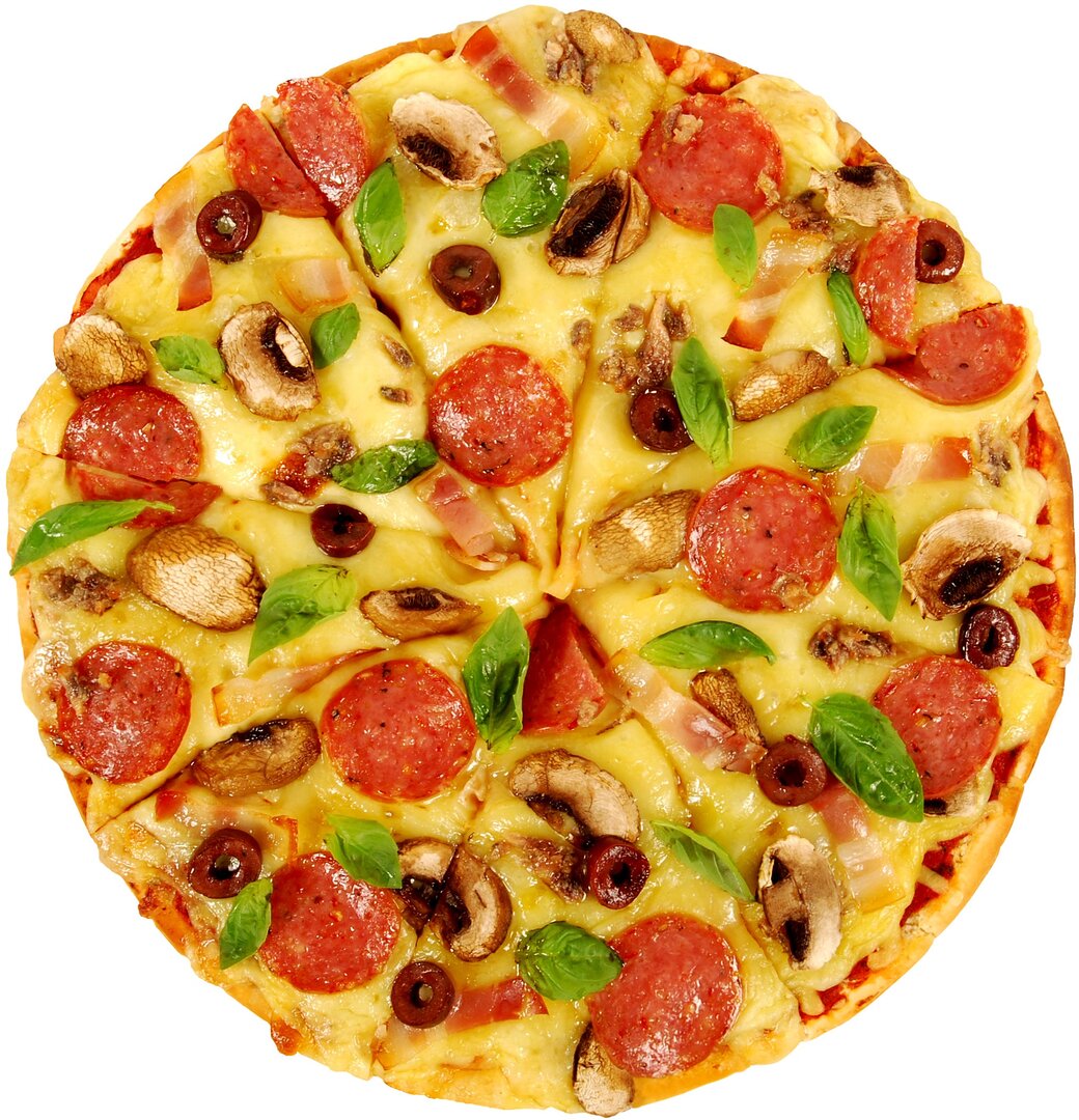 Tomate, lardons, pommes de terre, champignon, oignon, olives, emmental, mozzarella